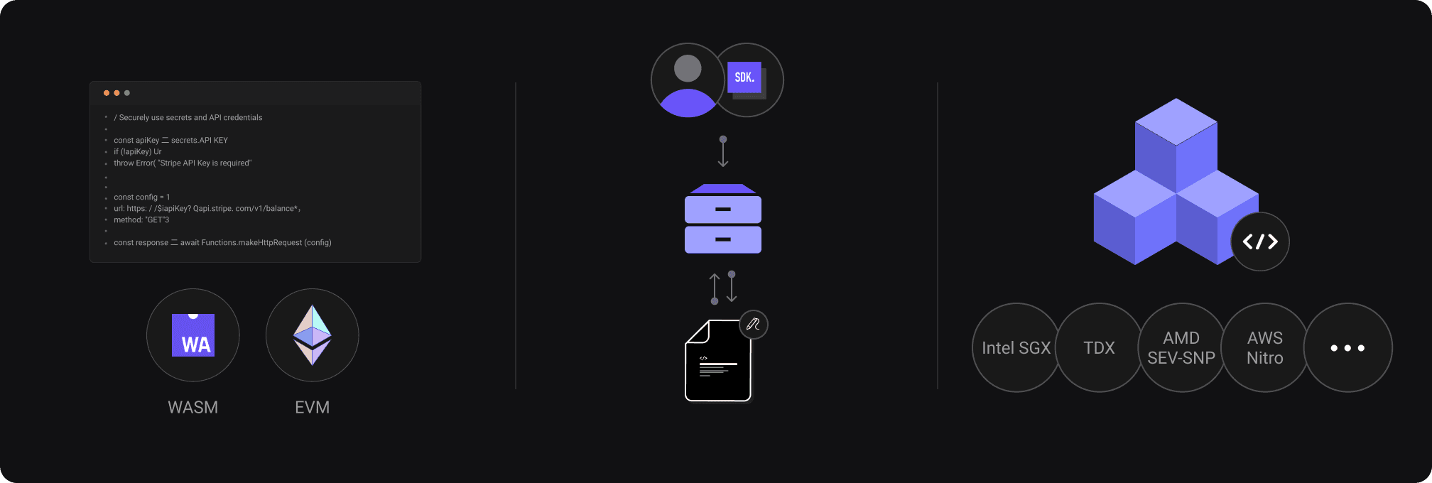 Clique leverages a network of enterprise-grade TEE nodes to support custom bytecode execution for various VMs, including EVM and WASM. Our robust security models support multiple TEE implementations including Intel SGX, TDX, AMD SEV-SNP, AWS Nitro, and more.